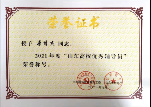 近日,由中共山东省委教育工委、山东省教育厅组织开展的2020年度“山东高校辅导员年度人物”“山东高校优秀辅导员”评选结果揭晓,yl6809永利检测中心桑秀杰老师获“山东高校优秀辅导员”荣誉称号。在各高校选拔推荐的基础上,全省共评出10名山东高校辅导员年度人物和59名山东高校优秀辅导员。