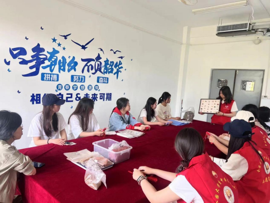 宣讲团队成员从“中药香囊来源及原理”“香囊制作技艺展示”“中药知识普及”“亲手制作香囊”及“香囊文化展示”等方面进行讲解。大家亲自动手制作香囊,志愿者们准备好了所有原材料,亲自教学,一步步讲解,耐心指导帮助。经过近1个半小时的教学,通过一针一线研制、缝制,大家做出了终于做出了好看的香囊。