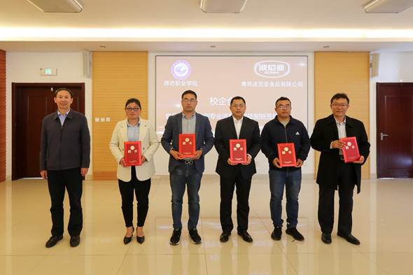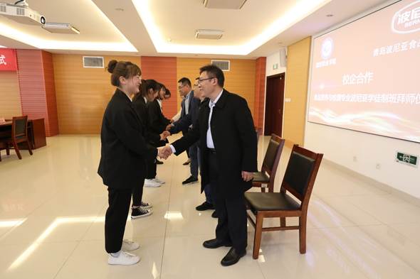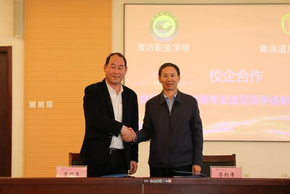 李瑞昌和段中航分别致辞。李瑞昌对青岛波尼亚食品有限公司多年来的支持表示感谢,介绍了学校近年来的发展、办学和突出成就等情况,他指出,中国特色现代学徒制是当前职业教育发展的趋势,希望双方积极探索校企协同育人机制、共同培养高素质技术技能型人才,促进学生的成长成才。段中航介绍了青岛波尼亚食品有限公司基本情况、企业文化、公司产品等,并表达了对本次合作的期望和祝愿。李瑞昌与段中航共同签署了yl6809永利官网集团-青岛波尼亚食品有限公司食品营养与检测专业校企共建现代学徒制合作协议。