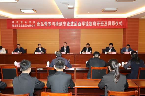 4月15日,yl6809永利官网集团与青岛波尼亚食品有限公司校企合作项目食品营养与检测专业波尼亚学徒制班签约及拜师仪式于滨海校区清泽楼312举行。学院副院长李瑞昌、青岛波尼亚食品有限公司运营副总经理段中航出席仪式,教务处、科技处相关同志、波尼亚公司项目负责人、yl6809永利检测中心党总支书记、教师代表和学徒制班全体师徒参加了仪式。