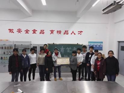 活动开始,指导老师向社团成员们讲解了实训室安全注意事项;指导老师依次介绍各种原辅料及性能、边讲解边演示饼干制作工艺,从原料的处理、面团的调制,到产品的成型、焙烤、包装,同学们认真学习每个工序的操作要领。饼干制作实操过程中,同学们根据老师介绍的知识,一丝不苟进行着操作,通过不同的色彩搭配及造型,一页页飘着奶香的花朵型饼干很快出炉。看着饼干精美的造型,同学们仿佛闻到了花香在实训室里飘荡。